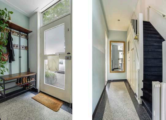 Binnenkomst in de hal waar de originele terrazzo vloer al direct de sfeer van het huis kenmerkt. In de hal vind je de trap naar de eerste verdieping, ge volgd door een praktische trapkast en het toilet.