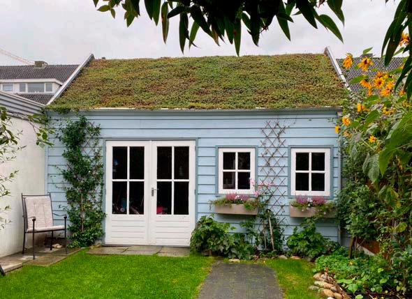 Dan is er de diepe achtertuin op het zuidwesten, heel gunstig gelegen ten opzichte van de zon en toegankelijk via de openslaande deuren aan de achterzijde. Het geheel is goed aangelegd met een mix van bestrating, gras en vaste beplanting. De pergola in het midden is ook voorzien van groen en de echte eye-catcher is de grote berging aan de achterzijde. Deze is opgetrokken uit beton met houten rabatdelen, geschilderd in een sfeervolle Scandinavische kleur en voorzien van een hellend groen dak.