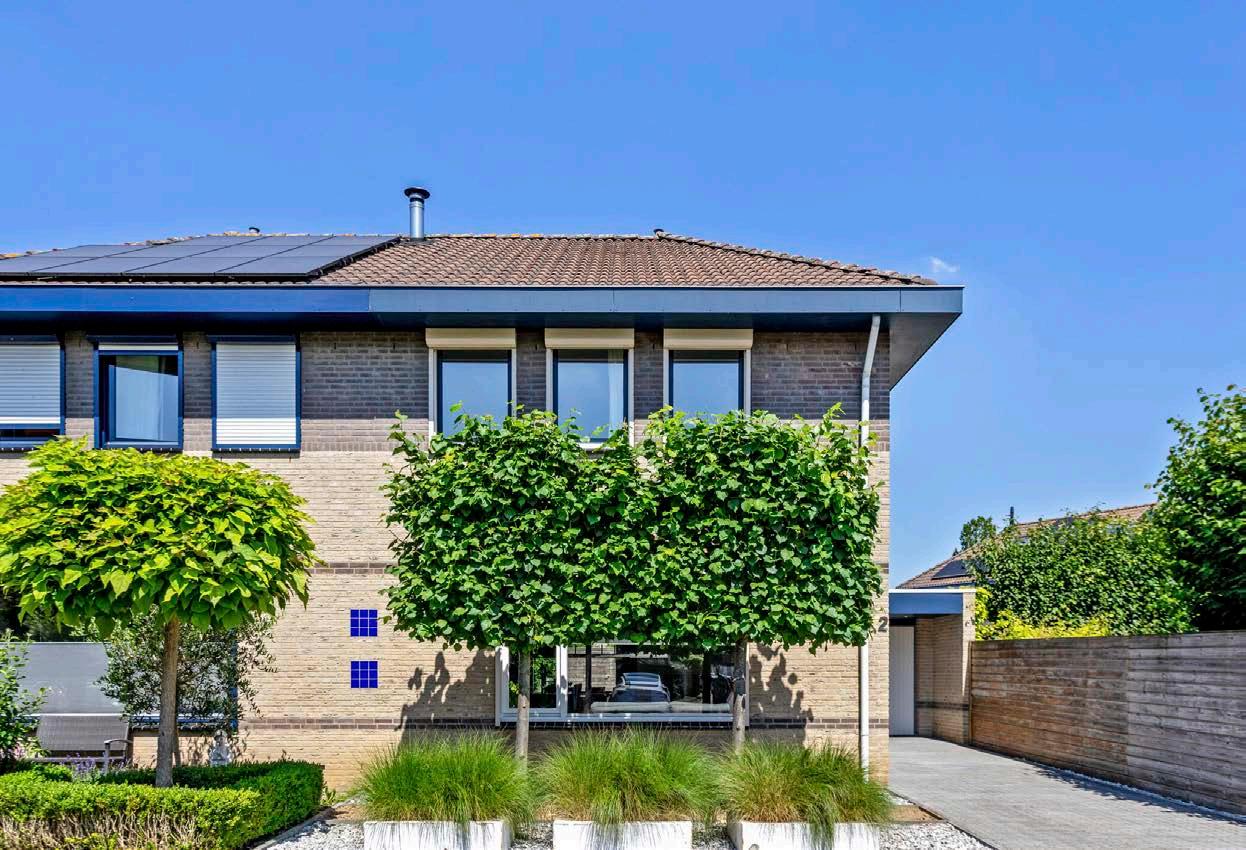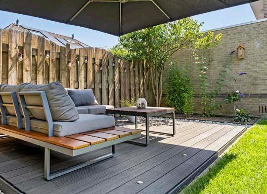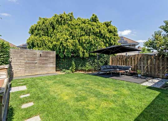 De moderne en eenvoudig te onderhouden achtertuin heeft voldoende ‘plekjes’ om op ieder moment van de dag te kunnen genieten van de zon. De garage is uitgerust met een bijkeuken voor extra opslag en geeft genoeg ruimte om lekker te kunnen hobbyen.