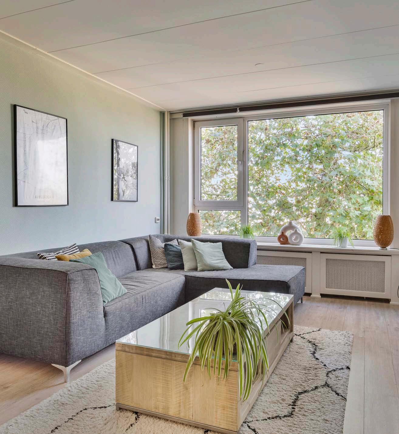 Een aantal dingen viel mij gelijk op aan deze woning. Vanuit de woonkamer kijk je direct op het bladerdak van de grote boom die tegenover het gebouw staat.
