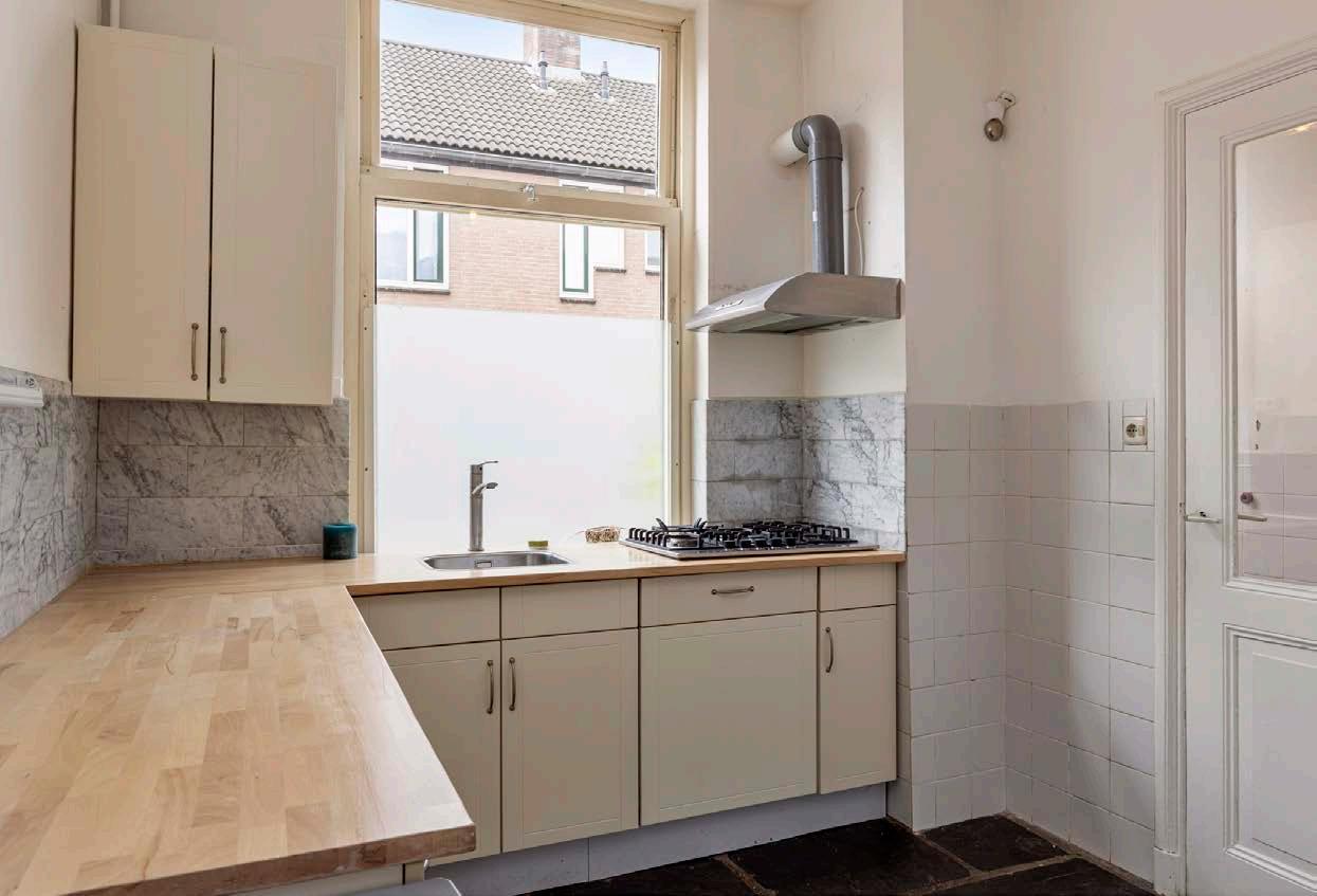 Aan de voorzijde kom je in de open keuken. Het geheel is geplaatst in een L-opstelling en verkeerd in redelijke staat. Verder biedt de keuken voldoende werk- en opbergruimte en zijn er een afzuigkap en een vaatwasser aanwezig.
