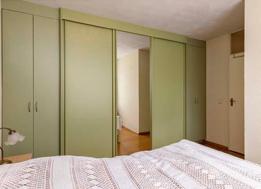 Vanuit de keuken heb je ook toegang tot een hal met twee slaapkamers en een badkamer. De slaapkamers zijn afgewerkt met een laminaatvloer en stucwerk op de wanden. In de grote slaapkamer beschik je over handige vaste kasten.