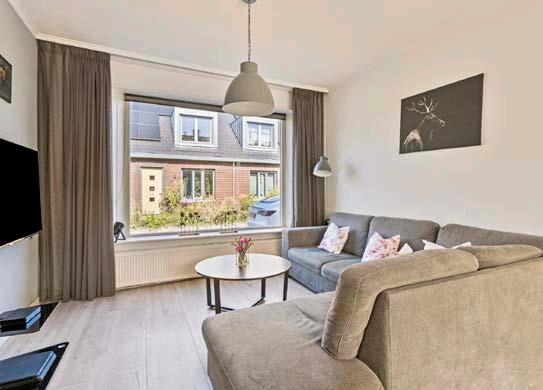 De lichte woonkamer, met veel natuurlijk lichtinval, nodigt je uit om te ontspannen. Vanuit de woonkamer heb je toegang tot de keuken en de serre.