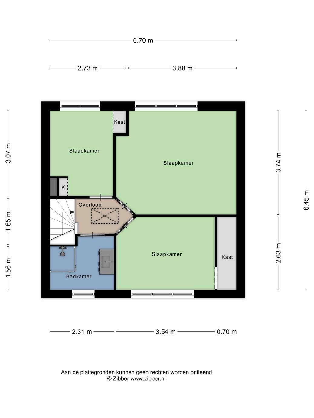 Een vaste trap leidt naar de eerste verdieping, waar je drie slaapkamers vindt. De overloop geeft toegang tot de slaapkamers en de badkamer.