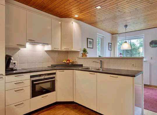 De keuken heeft een L-opstelling en is volledig uitgerust met inbouwapparatuur, waaronder een koelkast, vriezer, combi-oven en kookplaat.