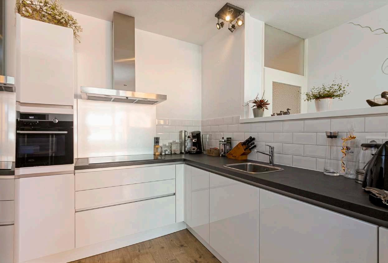 De moderne keuken is vernieuwd met strakke hoogglans afwerking en diverse inbouwapparatuur, waaronder een inductiekookplaat, afzuigkap, combi magnetron en een vaatwasser.