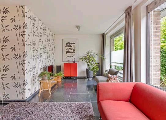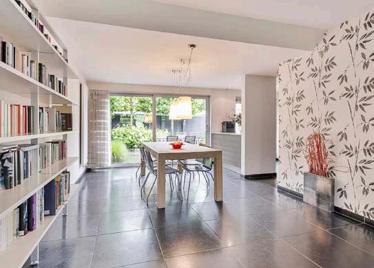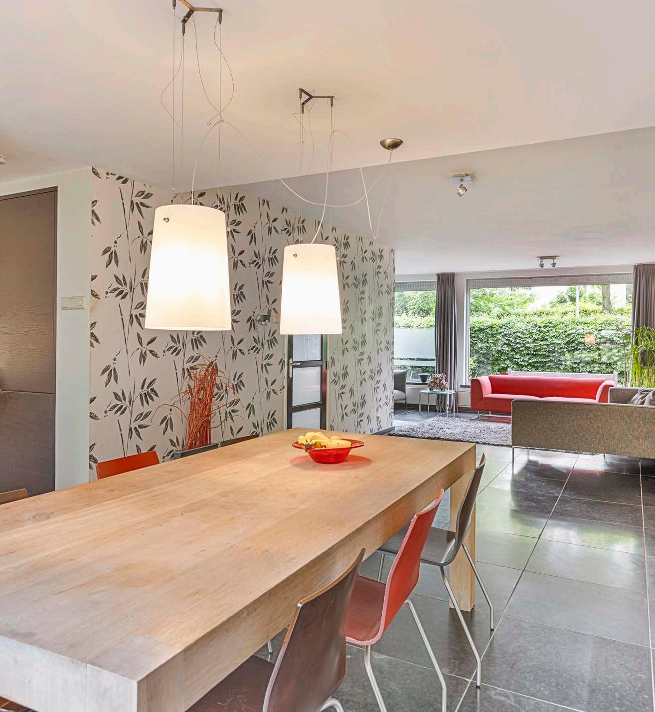 De L-vormige woonkamer van maar liefst 50 m² biedt genoeg ruimte om zowel een gezellige zithoek als een grote eettafel te plaatsen. Dankzij de brede schuifpui aan de achterzijde stroomt het daglicht rijkelijk binnen, waardoor de hele ruimte warm en uitnodigend aanvoelt.