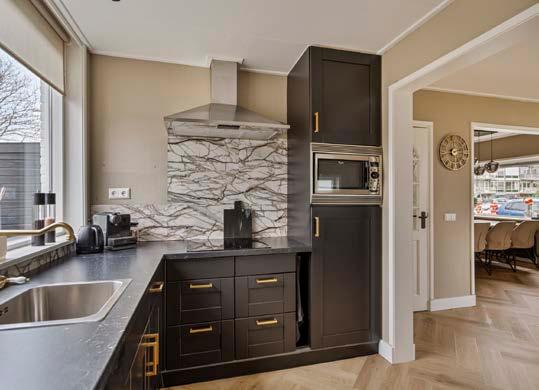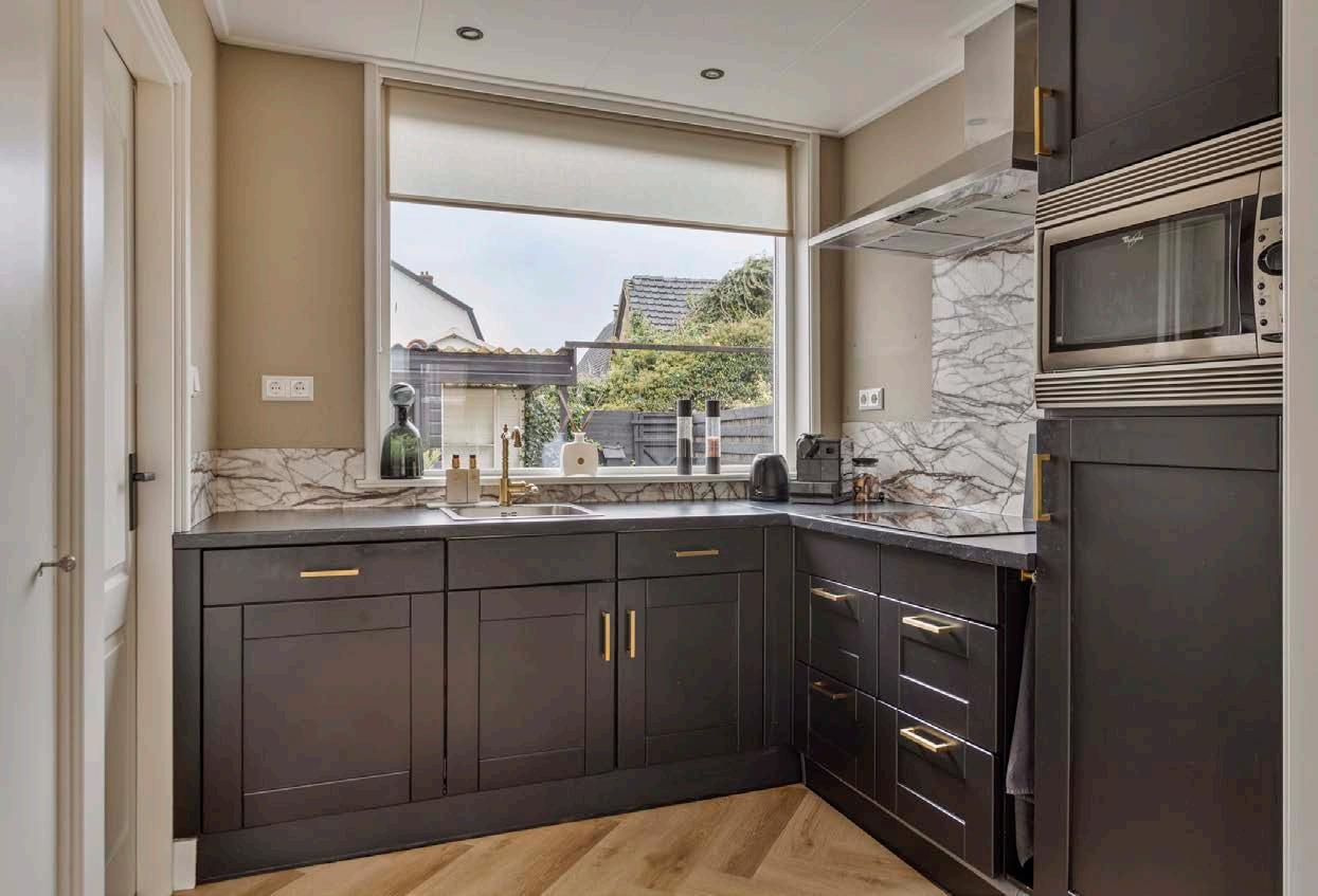 De keuken, direct grenzend aan de woonkamer, is een praktische en gezellige plek die van alle moderne gemakken is voorzien. Het is de ideale plek om je kookkunsten te etaleren, of je nu een snelle maaltijd bereidt of uitgebreid wilt tafelen met vrienden en familie. De keukenopstelling biedt voldoende werkruimte en opbergruimte, wat het dagelijks gebruik extra comfortabel maakt.