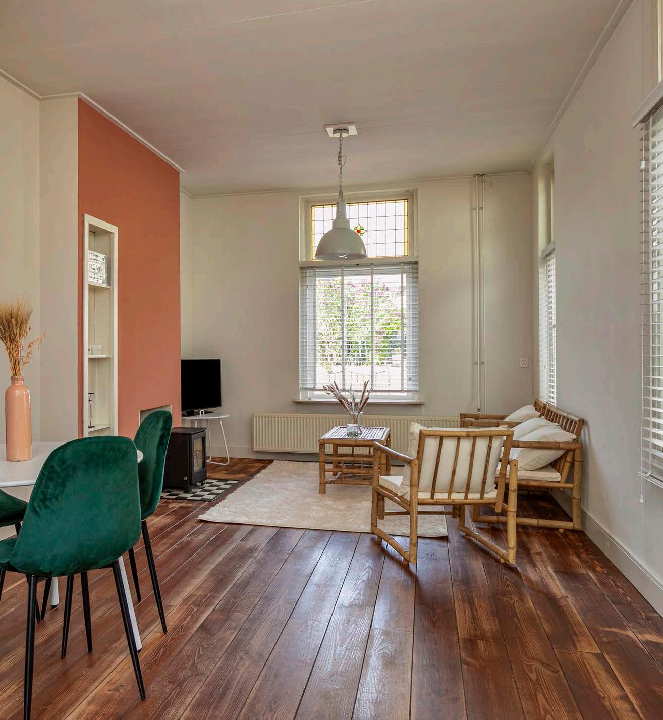 De woonkamer is heerlijk licht dankzij de ramen aan drie zijden. Je voelt je hier direct thuis dankzij de warme sfeer en de prachtige authentieke details, zoals de glas-in-lood ramen en de schouw met houtkachel. Er is voldoende ruimte voor een gezellige eethoek en een knusse zithoek.