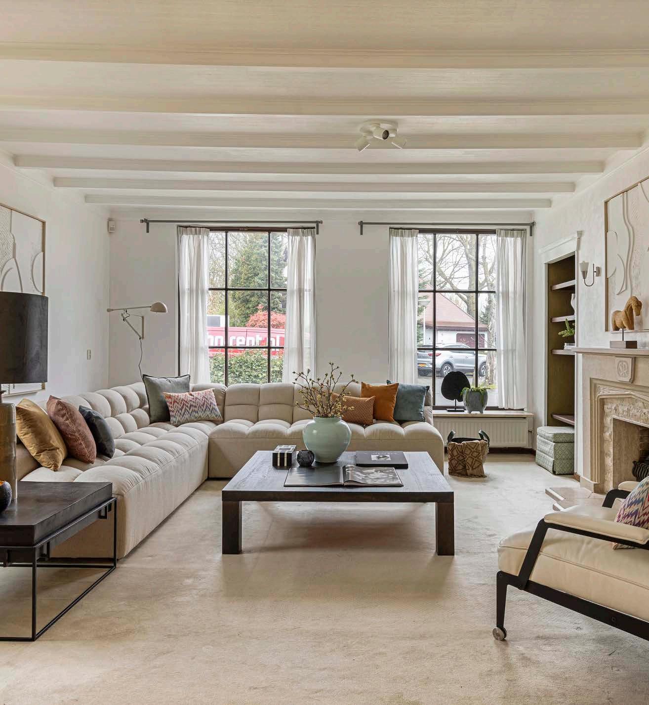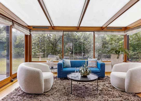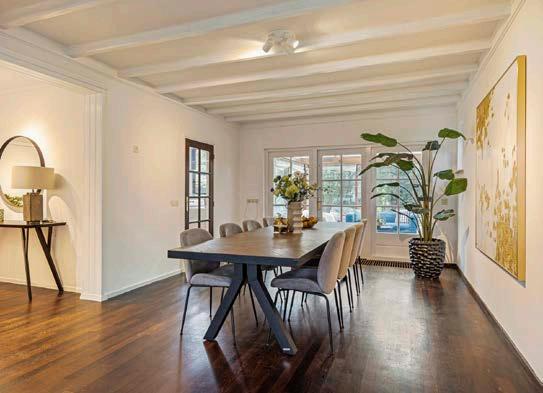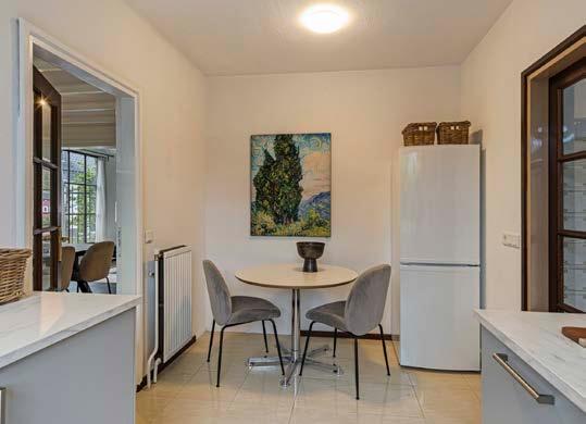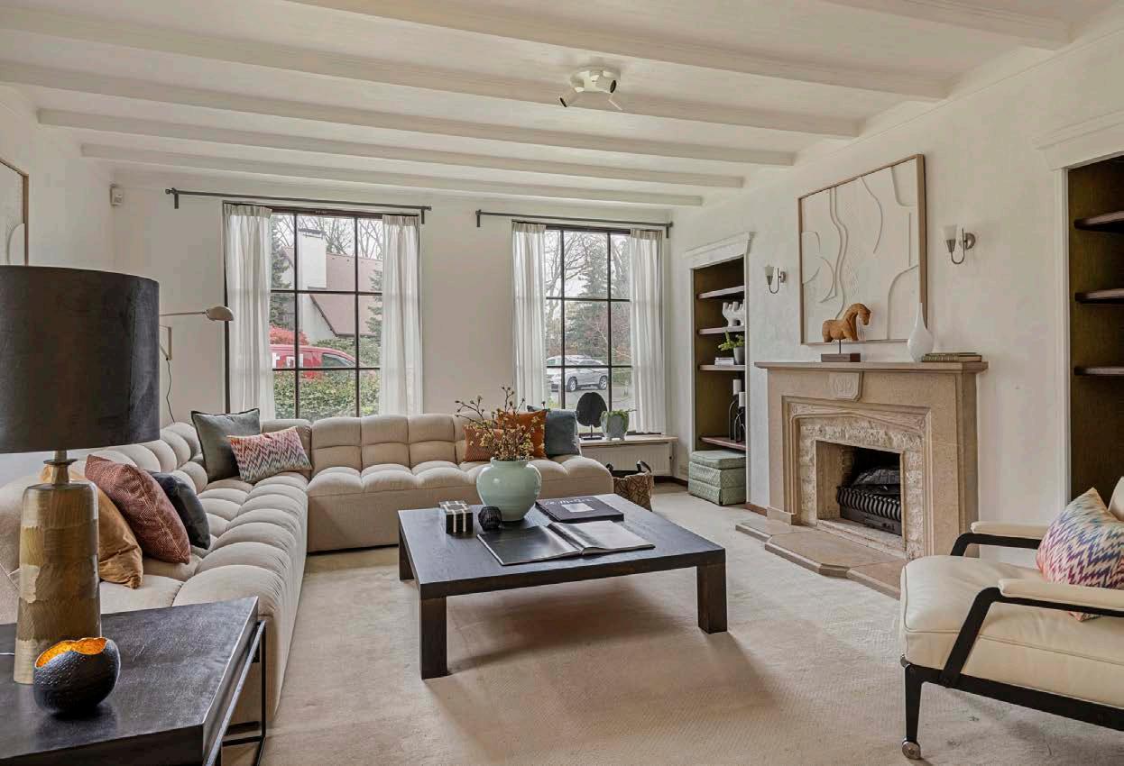 De woonkamer is een echte blikvanger door de grote raampartijen die zorgen voor een overvloed aan natuurlijk licht. De schouw met open haard vormt het warme hart van de ruimte, ideaal voor gezellige avonden. De dubbele openslaande deuren leiden naar de serre, die met de schuifpui een vloeiende overgang naar de tuin biedt.