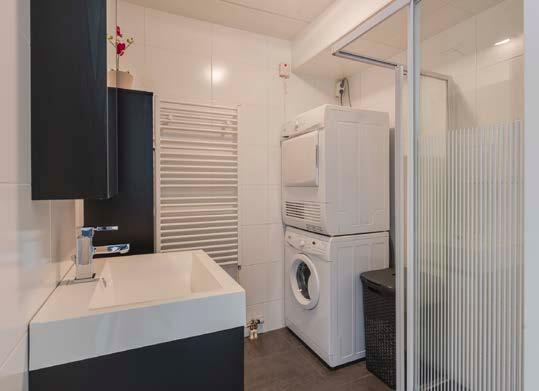 De badkamer is functioneel. De inloopdouche staat garant voor een verkwikkende start van de dag of een ontspannen afsluiting in de avond. Daarnaast is er een handige nis voor je wasmachine en droger, waardoor je wasruimte netjes uit het zicht blijft. Met een strakke uitstraling en een modern wastafelmeubel is deze badkamer niet alleen praktisch, maar ook een stijlvolle ruimte in je nieuwe thuis.