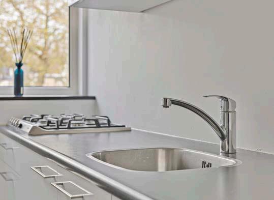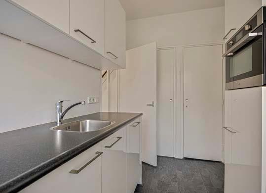 De moderne keuken is uitgerust met de nodige inbouwapparatuur en kijkt uit over de tuintjes aan de voorzijde.