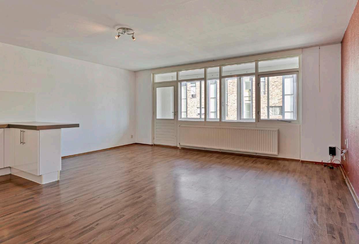 Vanuit de hal loop je door naar de woonkamer. De heerlijk ruime woonkamer heeft een grote raampartij met een deur naar de woningbrede loggia, waardoor er veel natuurlijk licht binnenvalt. Het geheel is netjes afgewerkt met een laminaatvloer en neutrale kleuren op de wanden, wat zorgt voor een verzorgde uitstraling.