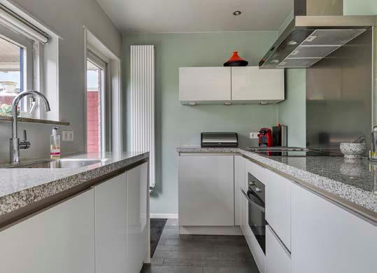 De open keuken staat in verbinding met de woonkamer. Uitgerust met een granieten aanrechtblad en moderne inbouwapparatuur zoals een inductieplaat, combi-oven en vaatwasser, is deze keuken een droom voor elke hobbykok. Het is een plek waar gezelligheid en functionaliteit samenkomen, en waar je tijdens het koken altijd in contact blijft met familie of gasten in de woonkamer.