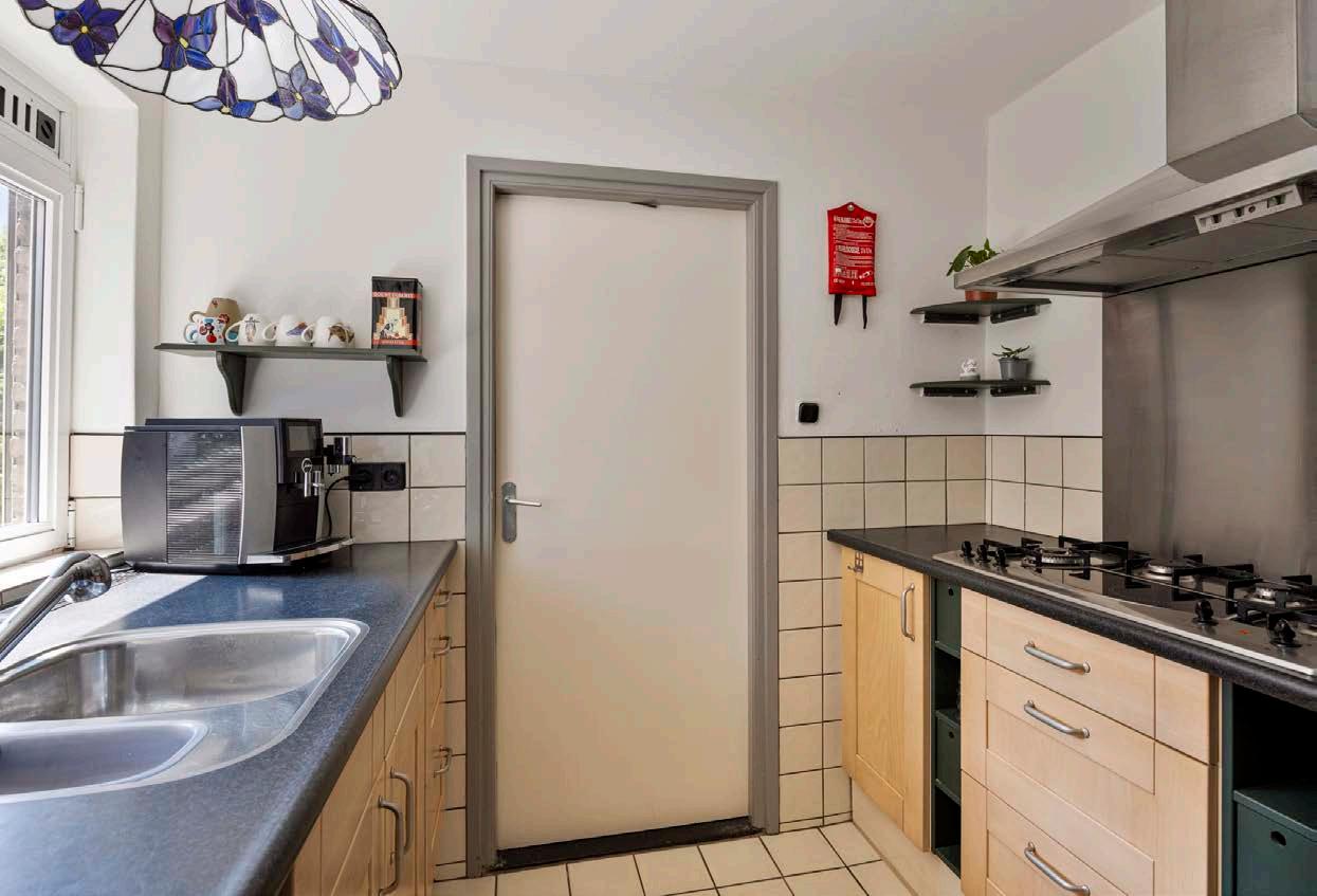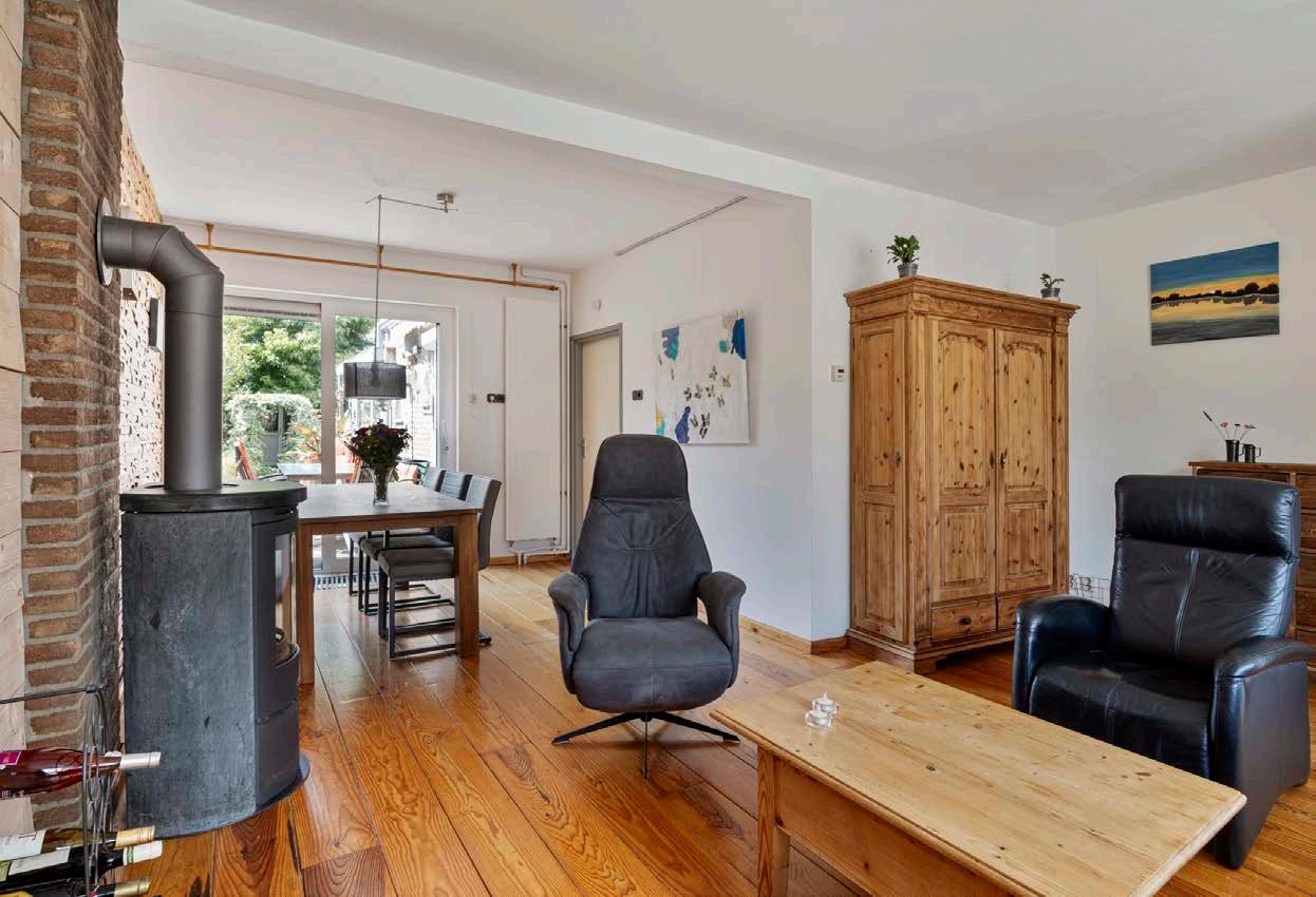 Bij binnenkomst in deze woning word je verwelkomd in de hal die direct toegang biedt tot de lichte woonkamer. Grote ramen laten volop daglicht binnen en geven een mooi uitzicht op de tuin. De houten vloer straalt warmte uit zeker in combinatie met de centraal gelegen houtkachel.