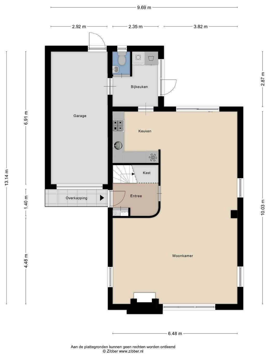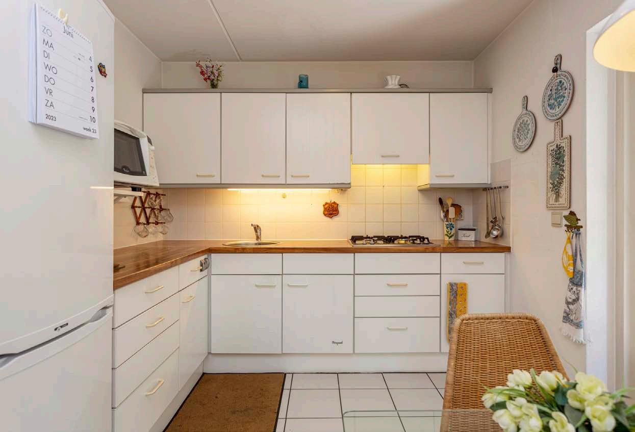 De nette open keuken is voorzien van inbouwapparatuur, zoals een gaskookplaat en afzuigkap. Vanuit de keuken kom je in de handige bijkeuken met vaatwasser, witgoedaansluiting en toegang tot de toiletruimte, inpandige garage en de tuin.