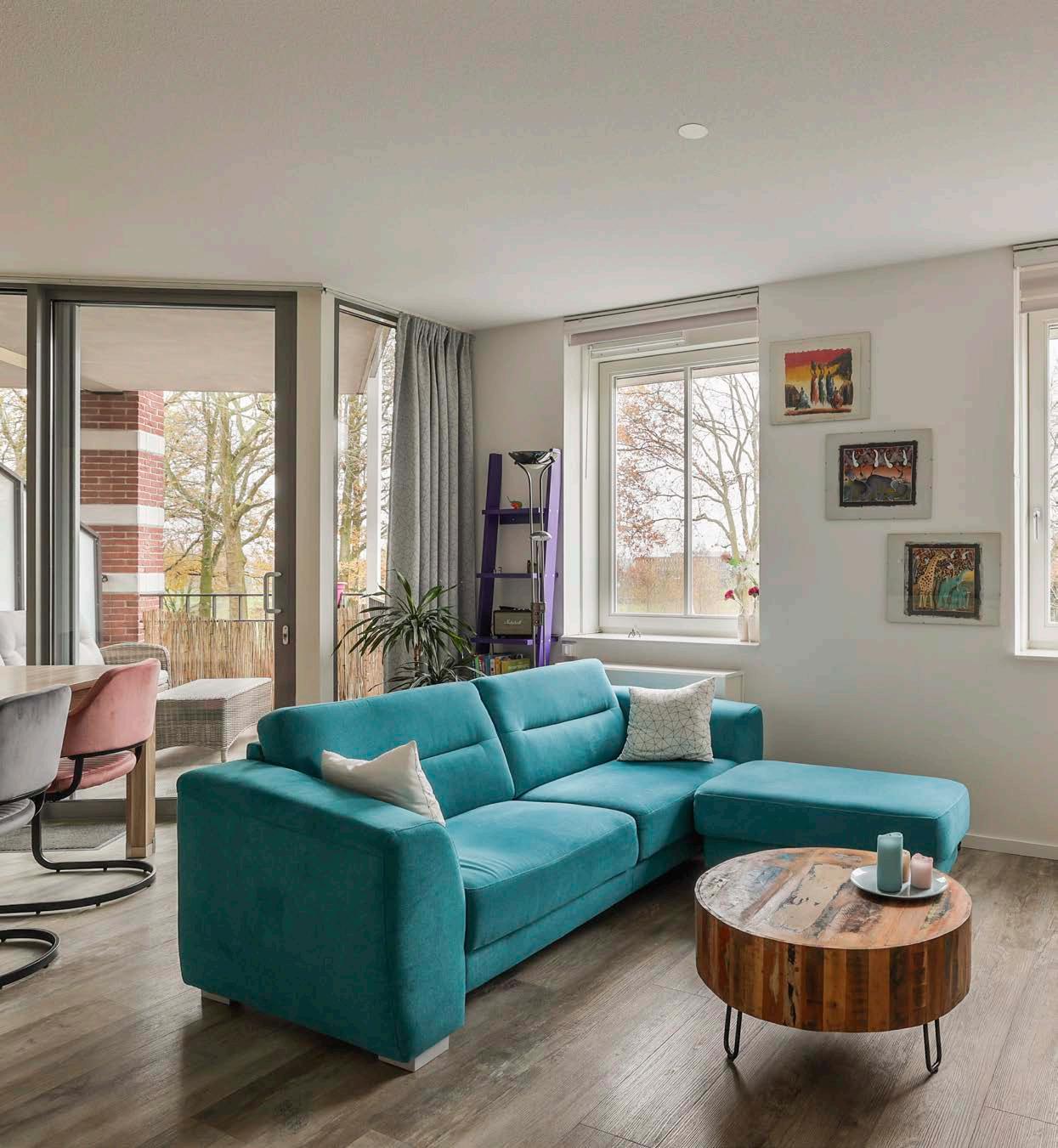 De woonkamer bevindt zich aan de achterzijde en door de ramen geniet je van mooi uitzicht op de woonomgeving. Jou valt direct op hoe verzorgd het geheel is afgewerkt met een pvc vloer en glad vliesbehang op de wanden. Heb jij een idee hoe je de ruimte gaat inrichten?
