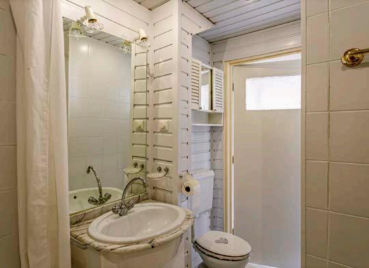De badkamer is ingericht met een toilet, wastafel, ligbad en douche.