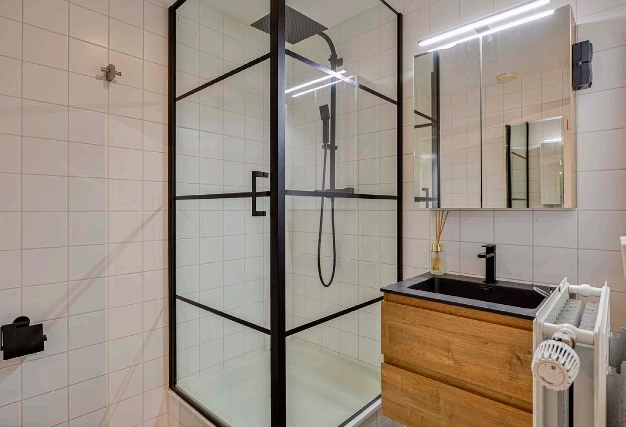 De moderne badkamer is netjes afgewerkt en de perfecte plek om heerlijk te ontspannen na een lange dag of fris en fruitig de nieuwe dag te beginnen.