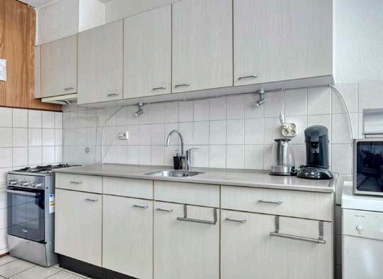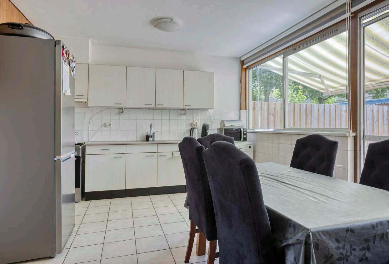 Via schuifdeuren kom je in de eetkamer, die aan de achterkant van de woning ligt. Deze ruimte biedt voldoende plek voor een eettafel, waar je gezellig kunt tafelen met vrienden of familie. De aangrenzende keuken is functioneel ingericht en voorzien van voldoende werkruimte. Vanuit de eetkamer loop je direct door naar de tuin, wat een praktische verbinding geeft tussen binnen en buiten.