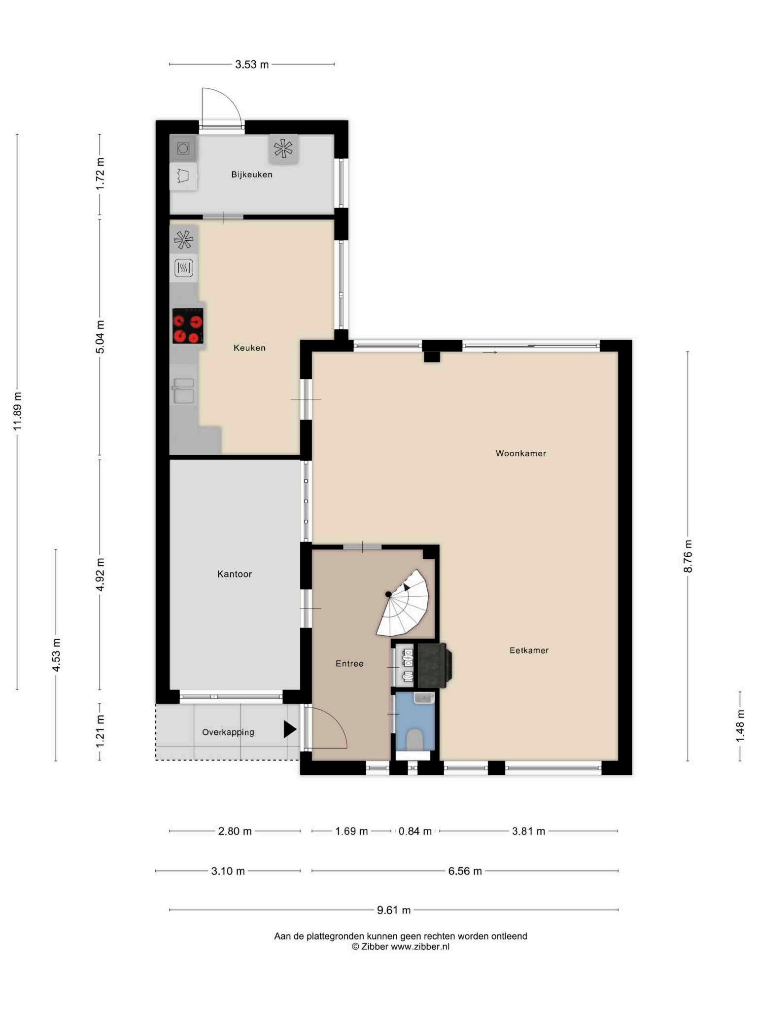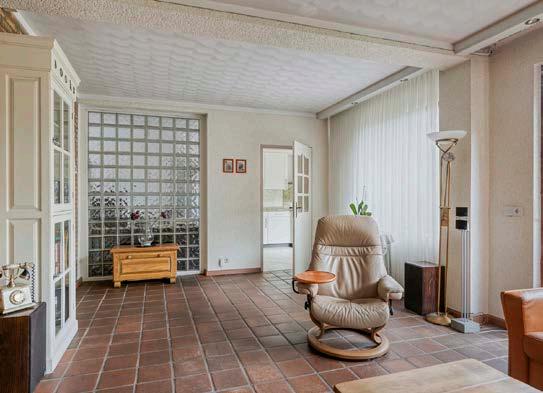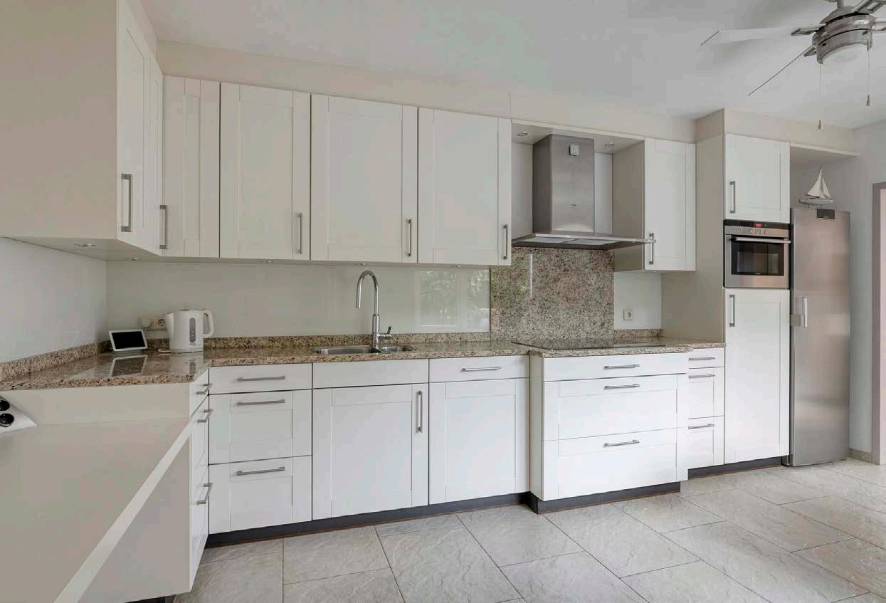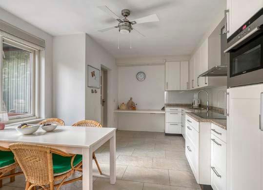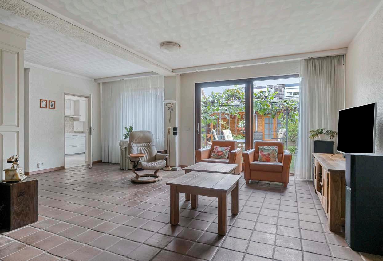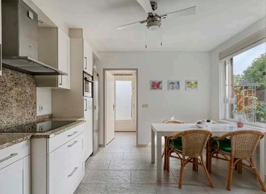 Aansluitend ligt de keuken, voorzien van koelkast, vaatwasser, combi-oven, inductiekookplaat en voldoende kast- en werkruimte, klaar om naar eigen smaak te moderniseren. Vanuit de keuken loop je door naar de bijkeuken, waar de aansluitingen voor wasmachine en droger zich bevinden, praktisch en goed weggewerkt. Er bevinden zich ook aansluitingen voor warm en koud water en afvoer