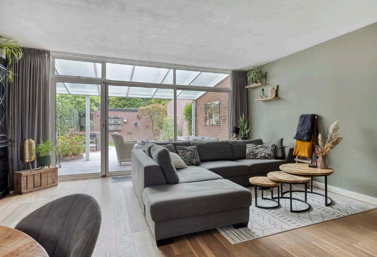 Ruime doorzonwoonkamer met parketvloer en een schuifpui naar het overdekte buitenterras en de achtertuin.