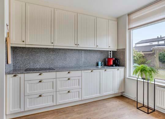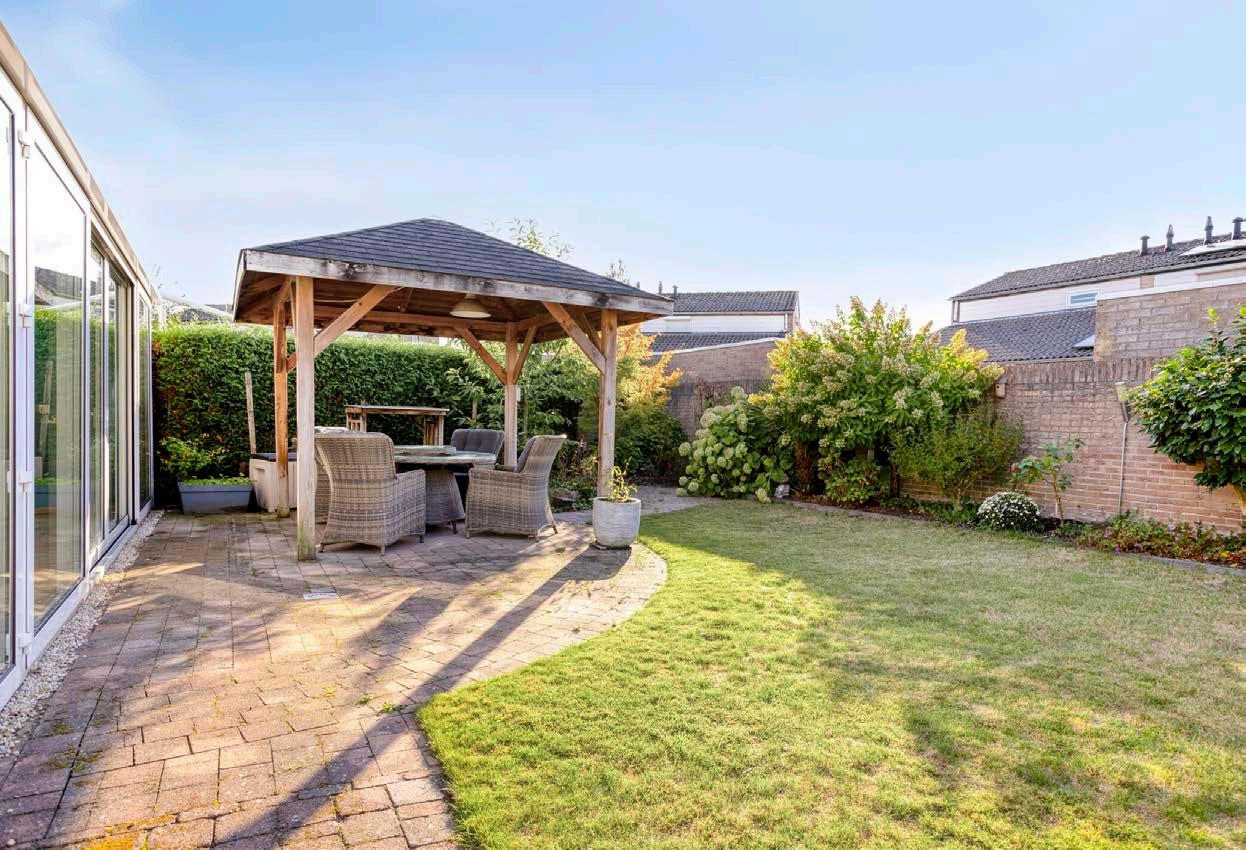 De achtertuin is royaal en zonnig (gelegen op het noordwesten), fraai aangelegd met gazon, sierbestrating, kleurrijke borders en twee terrassen. Dankzij de overkapping en zonneluifel is er altijd een fijne plek om in de zon of juist in de schaduw te zitten. Een tuin om te genieten, te ontspannen en gezellig te borrelen met vrienden of familie. Vergeet ook zeker de ruime garage niet: De royale inpandige garage is ideaal voor zowel auto als extra bergruimte. Voorzien van een elektrische deur, loopdeur, wateraansluiting, elektra en handige bergvliering.