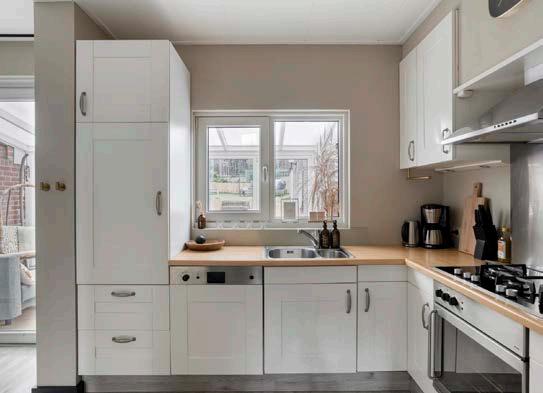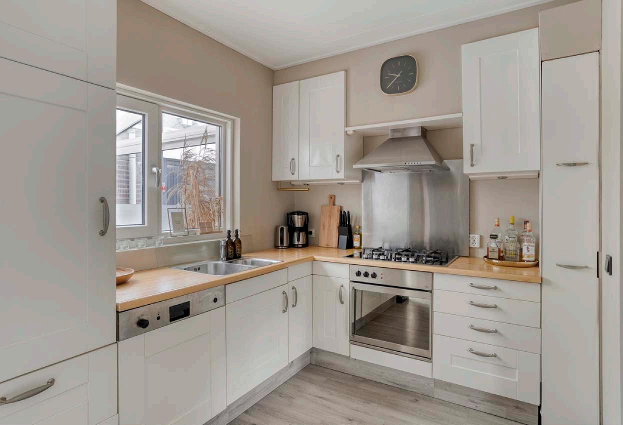 De halfopen L-keuken van De Gebroek 92 is heerlijk licht en vormt een natuurlijke verbinding met de woonkamer, waardoor koken en samenzijn moeiteloos samenkomen. Het houten werkblad met de lichte keukenkastjes geeft de ruimte een frisse, warme uitstraling. Dankzij de efficiënte L-opstelling is er fijne werk- en bergruimte, terwijl je kookt op gas.