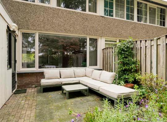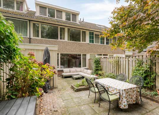 De achtertuin ligt op het oosten, waardoor je in de ochtendzon kunt genieten van je koffie en ontbijt. Een stenen terras biedt ruimte voor een grote eettafel, terwijl de groenbegroeiing en volwassen bomen aan de achterzijde zorgen voor een natuurlijk, besloten karakter.
