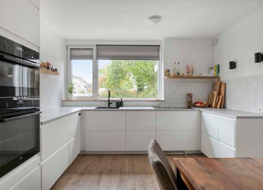 De keuken – halfopen en eigentijds – is in directe verbinding met de woonkamer. Deze is voorzien van alle denkbare gemakken: een AEG inductiekookplaat met afzuiging, oven en combioven, vaatwasser, koelkast, vriezer, Quooker en meer dan voldoende kastruimte. Het raam aan de voorzijde biedt een levendig uitzicht op de straat en zorgt ook hier voor een lichte, prettige sfeer.