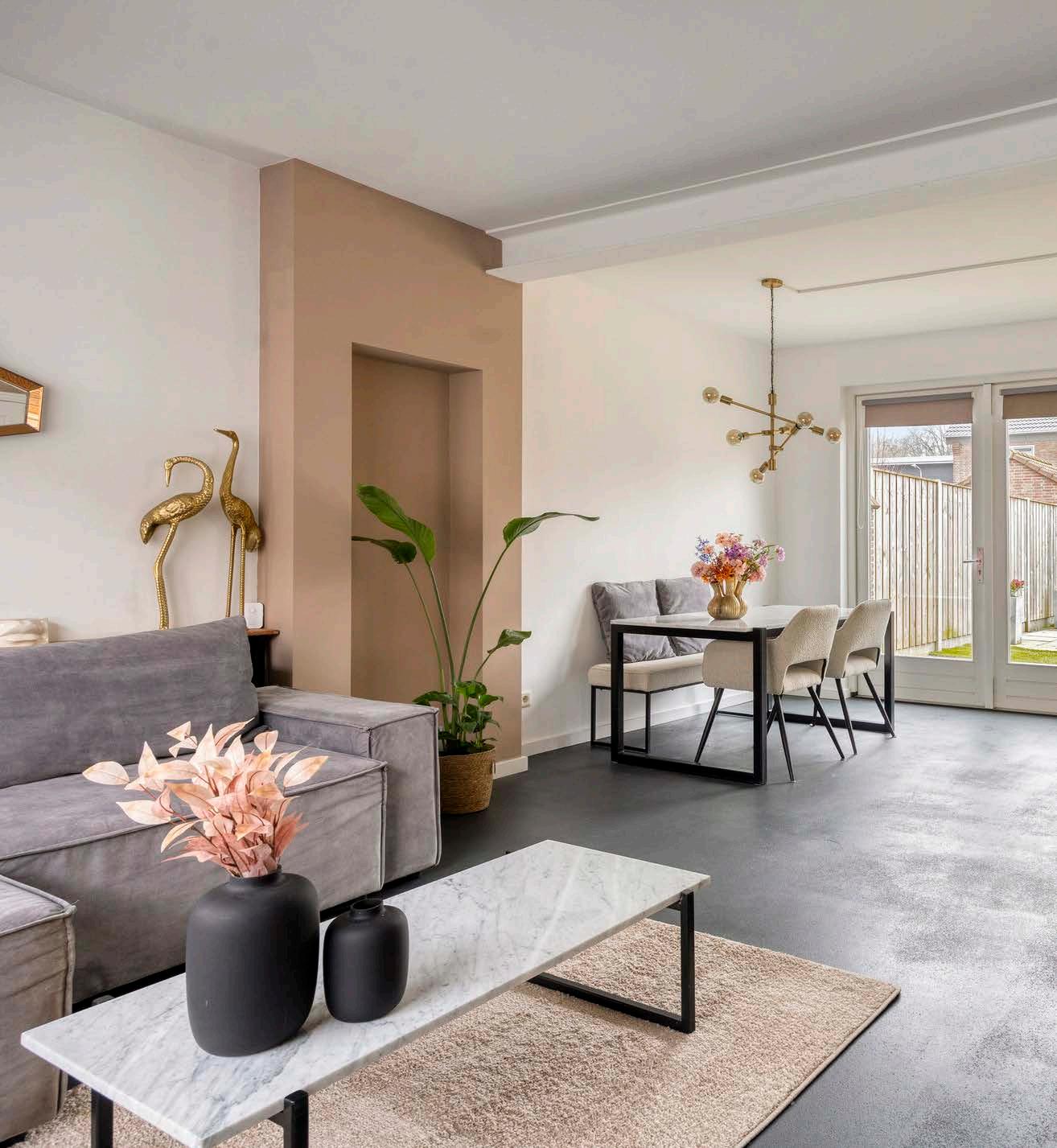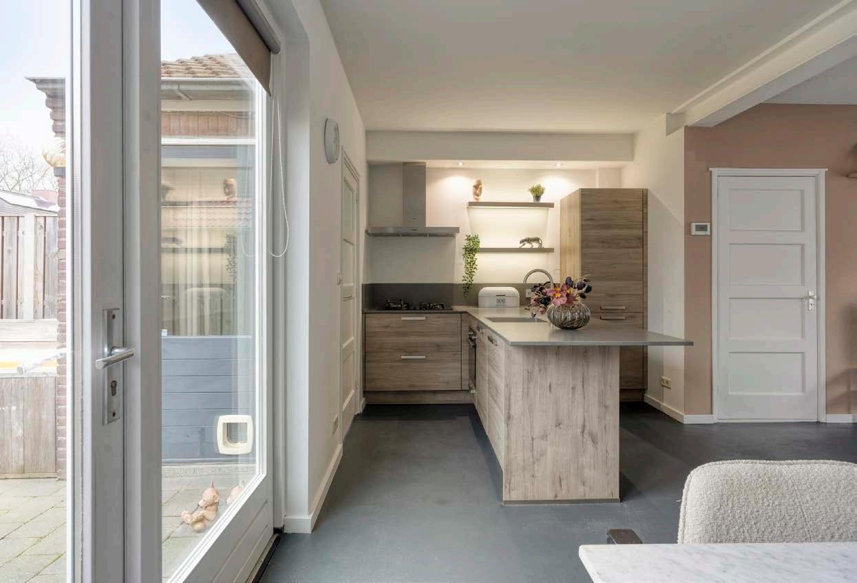 De woonkamer is ruim opgezet en baadt in licht dankzij grote raampartijen en openslaande tuindeuren. De vloerverwarming zorgt het hele jaar door voor aangename temperaturen, terwijl een praktische vaste kast extra opbergruimte biedt. Dit is een prachtige plek om te ontspannen, te genieten van gezinsmomenten of vrienden te ontvangen.