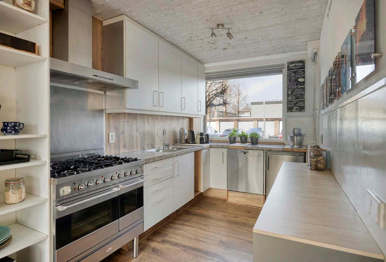 De open keuken in U-vorm is uitgerust met moderne apparatuur zoals een vaatwasser, dubbele oven en koelkast. Dé plek waar koken en gezelligheid samenkomen! De handige voorraadkast onder de trap zorgt voor extra opbergruimte. Daarnaast beschikt de woning over een praktische berging/ bijkeuken, ideaal voor extra opslagruimte, voorzien van een tweede oven, een extra koelkast en een vriezer.