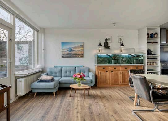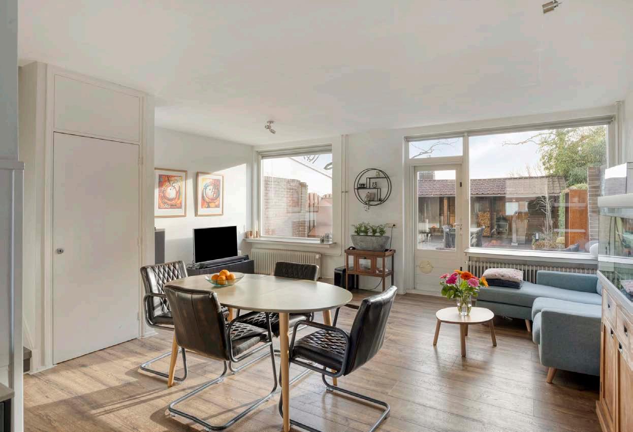 Vanuit de hal met toilet loop je door naar de warme, sfeervolle woning, en je aandacht wordt meteen getrokken door de lichte, ruime woonkamer.De woonkamer is een fijne en lichte ruimte dankzij grote ramen dat een prachtig zicht biedt op de tuin