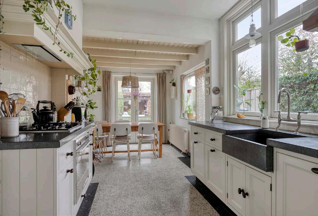 Achterin de woning bevindt zich de uitgebouwde keuken, waar een gezellige zithoek is gerealiseerd. De klassieke terrazzo vloer met vloerverwarming maakt het plaatje compleet, met meer dan genoeg ruimte om je kookdromen waar te maken.