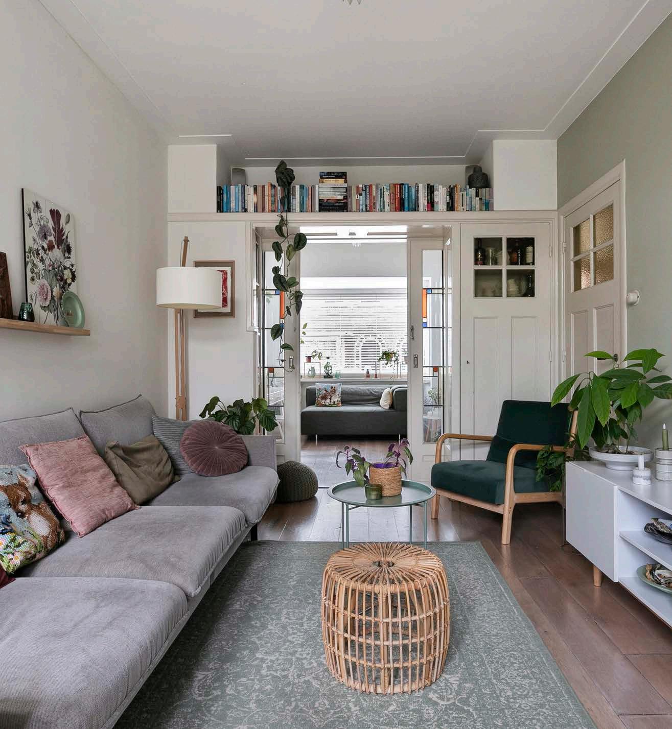Sfeervolle woonkamer met erker: Licht, ruimte en charmante details zoals openslaande deuren naar de tuin.