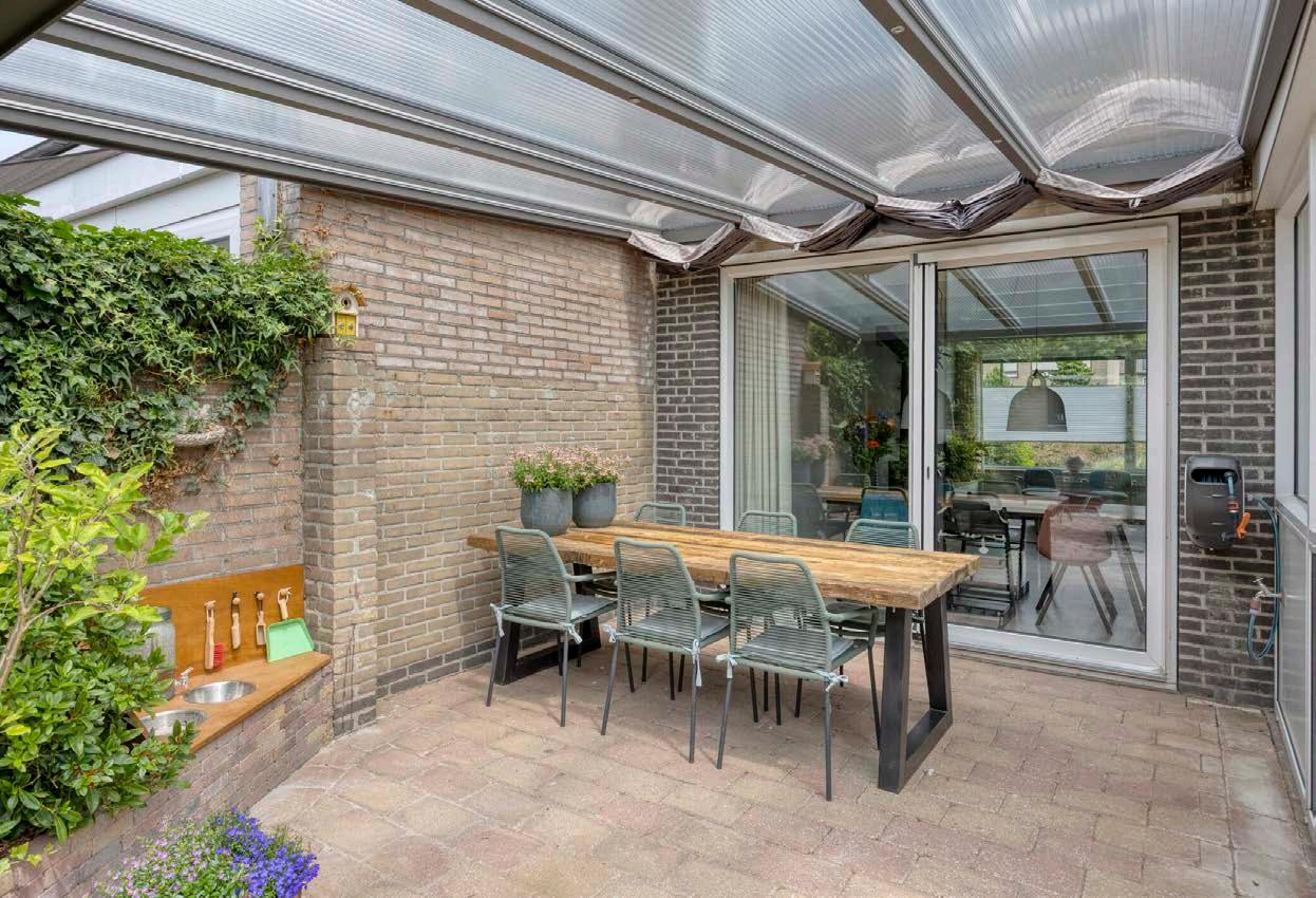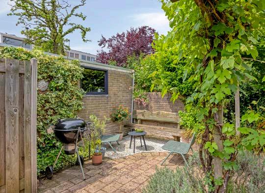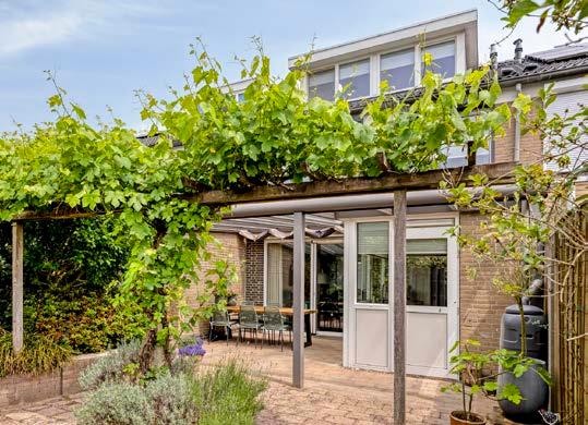 De fraai aangelegde tuin (ca. 11 meter diep) ligt op het westen en biedt volop middag- en avondzon. U geniet hier van een aluminium veranda (2016) met inbouwspots, een pergola, verhoogde borders, een buitenkraan, een stenen berging (ca. 10 m²) met elektra én een vrije achterom.