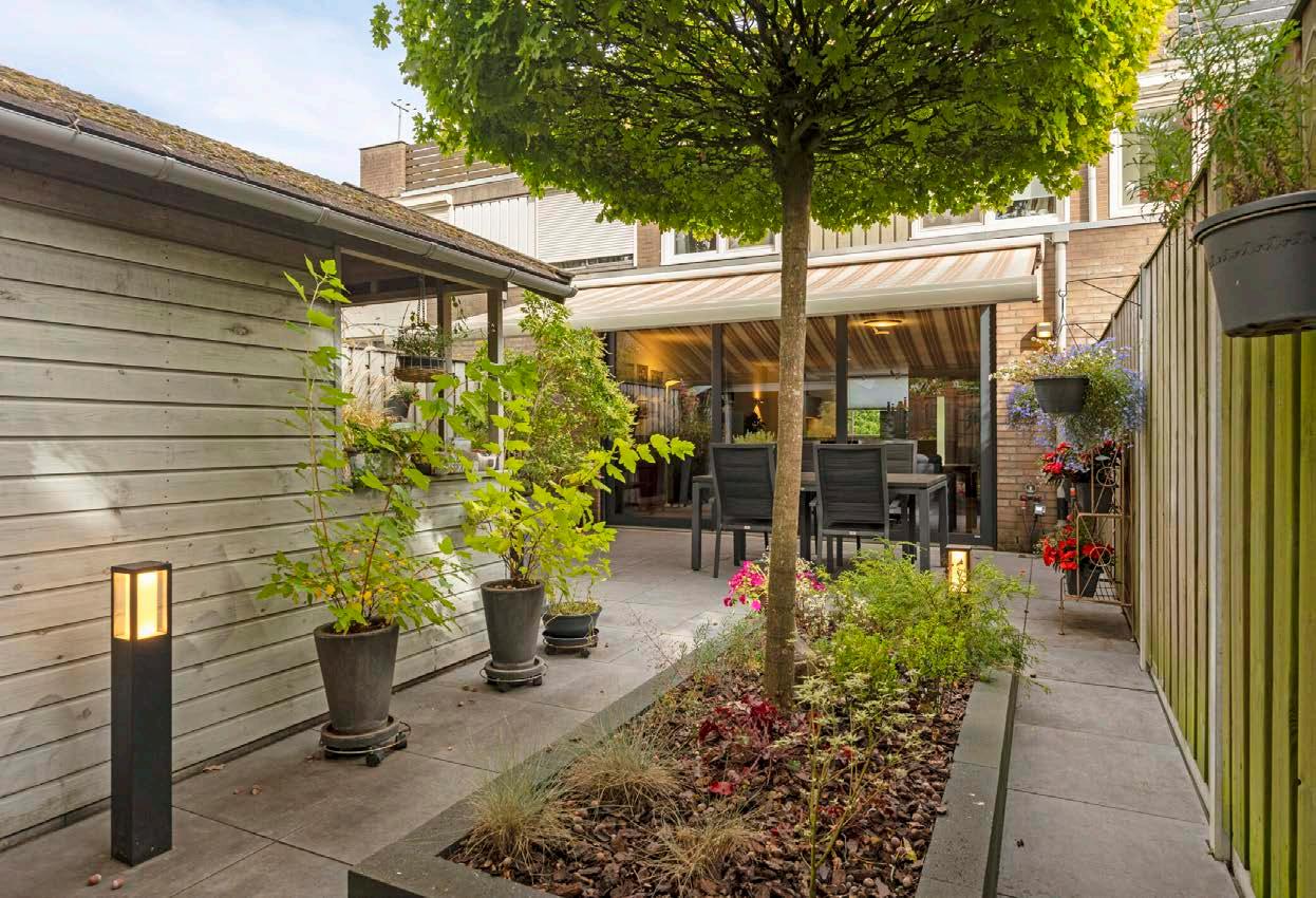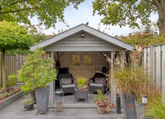 En dan de tuin. Met keramische tegels, een mooie groene border met beregeningscomputer en een open tuinhuis is dit een buitenruimte die uitnodigt tot leven. Of je nu een boek leest in de schaduw, een borrel drinkt met vrienden of de kinderen ziet spelen: hier wil je zijn.