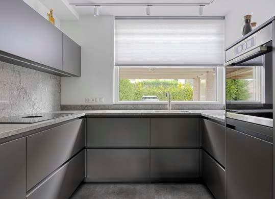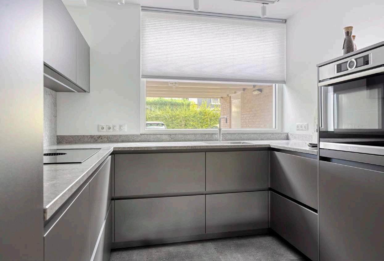 Aan de voorzijde vind je de maatwerkkeuken van Van Diessen, met recht een blikvanger. Het zwarte design, gecombineerd met hoogwaardige inbouwapparatuur, maakt deze keuken tot het hart van het huis. Hier bereid je met gemak een uitgebreid diner of een snelle maaltijd, terwijl je geniet van zicht op het rustige straatbeeld.
