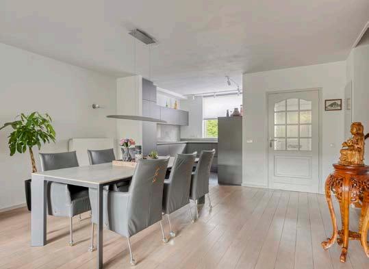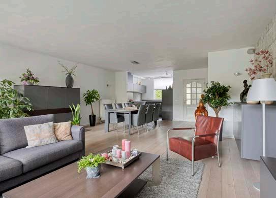 De hal verwelkomt je ruim en overzichtelijk. Hier bevinden zich het toilet met fontein, de meterkast en de trapopgang. Je voelt direct dat de afwerking klopt: strak, modern, verzorgd. In de uitgebouwde woonkamer komt alles samen. Aan de voorzijde vind je de maatwerkkeuken van Van Diessen. De achterzijde van de woonkamer is royaal uitgebouwd en voorzien van een prachtige glaspartij tot aan de vloer. Hierdoor stroomt het licht binnen en geniet je dag in, dag uit van een gevoel van ruimte en vrijheid. De eikenhouten vloer voegt warmte toe en loopt mooi door richting de trap naar de eerste verdieping.