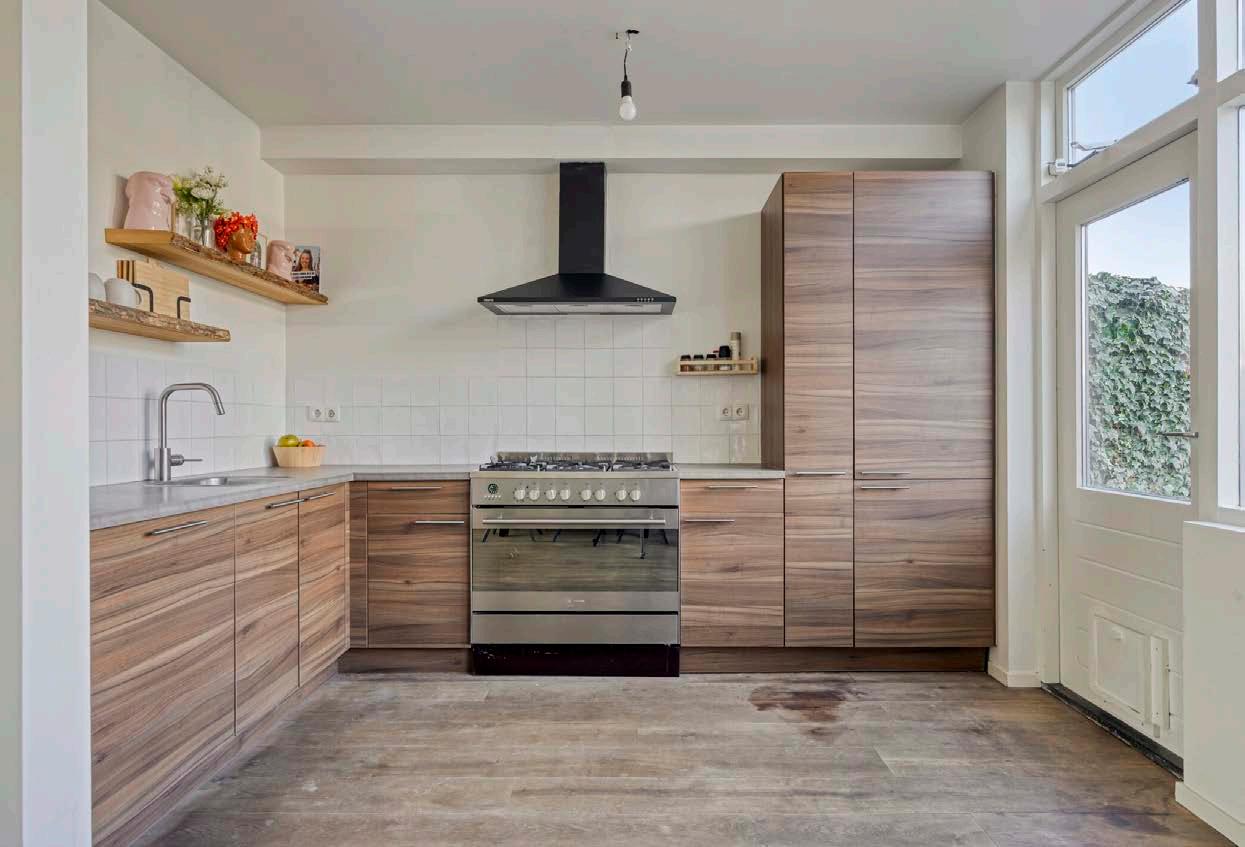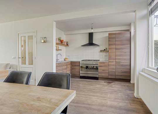 Aan de achterzijde bevindt zich de open keuken in een praktische opstelling. De keuken is voorzien van diverse inbouwapparatuur, waaronder een fornuis met oven en gaskookplaat, afzuigkap, koelkast, vriezer en een vaatwasser. Vanuit de keuken is er een fijne verbinding met zowel de woonkamer als de tuin.