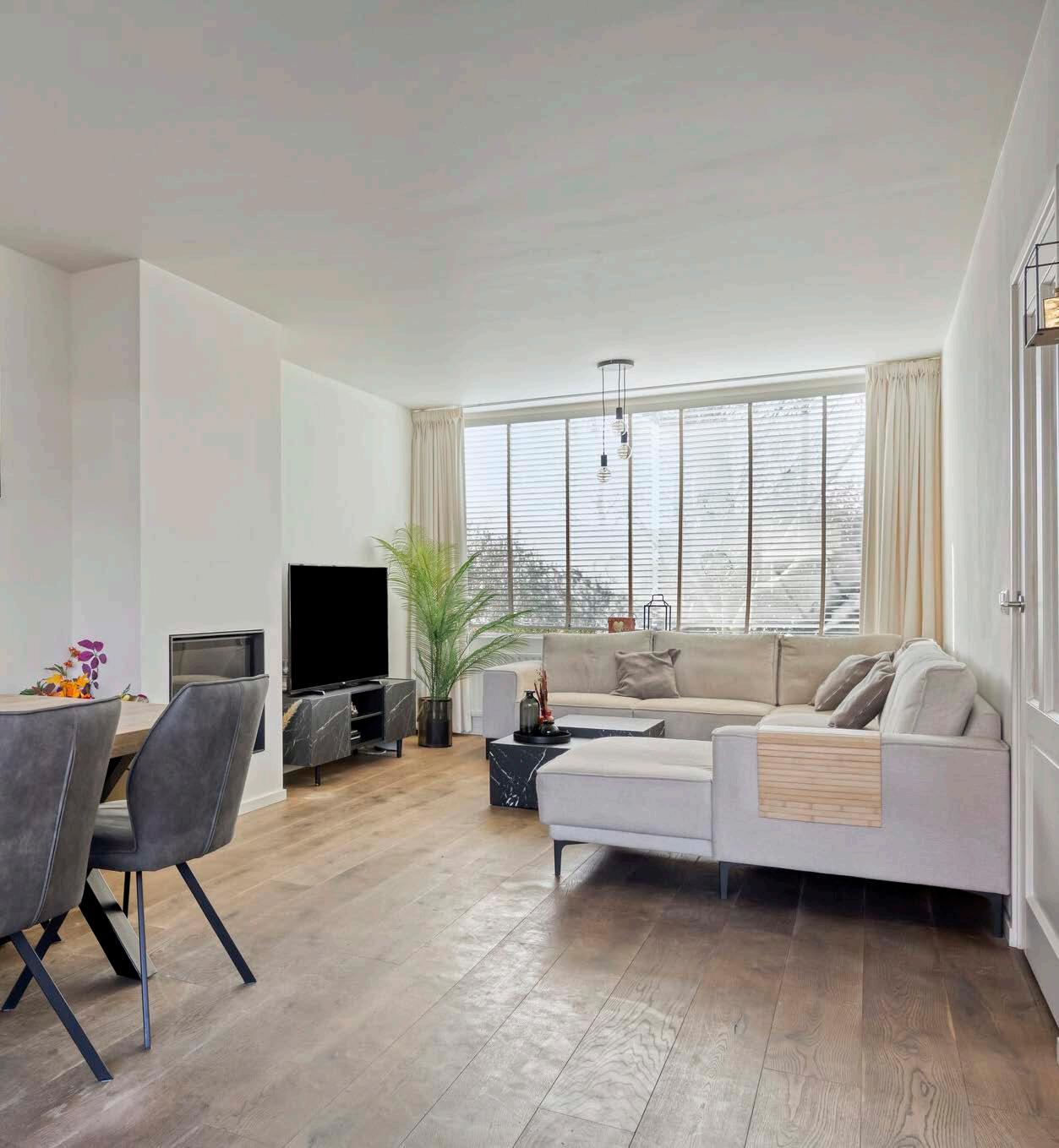 De ruime woonkamer is licht en sfeervol dankzij de grote raampartijen aan de voor- en achterzijde. De fraaie eiken parketvloer, strak gestucte wanden en het prettige daglicht zorgen voor een warme en uitnodigende leefruimte. Een sfeervolle gashaard en een designradiator geven het geheel extra karakter.