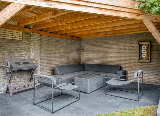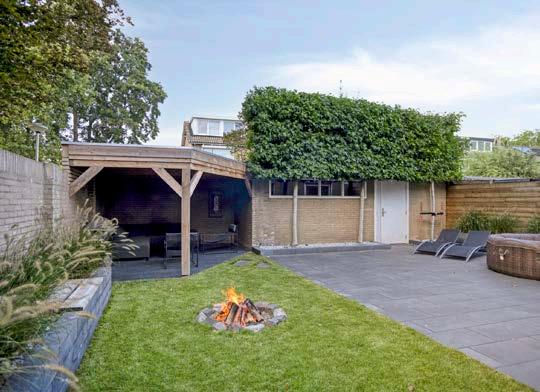 Ook in je eigen tuin kun je heerlijk ontspannen. Tijdens zomerse dagen draait de zon de hele dag met de tuin mee, en ’s avonds geniet je van de warmte bij de firepit. Toch even afkoelen? Dat kan onder de grote, schaduwrijke overkapping.