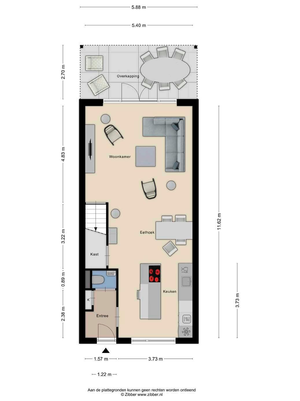 Entree/ hal, meterkast, toilet, open keuken voorzien van eiland en inbouwapparatuur en woonkamer.