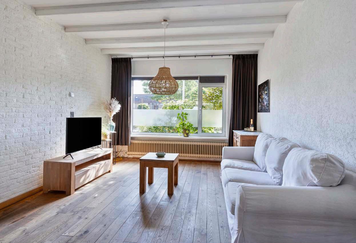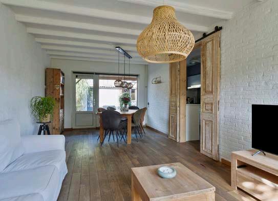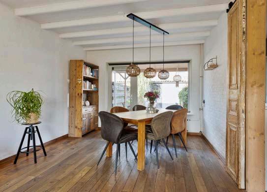 De woonkamer heeft een landelijke uitstraling dankzij de mooie houten vloer die perfect aansluit bij de robuuste houten schuifdeur richting de keuken. Hier is duidelijk met liefde voor detail gewerkt! De woonkamer is licht en ruim, met voldoende plek voor een gezellige zithoek én een knus eetgedeelte.