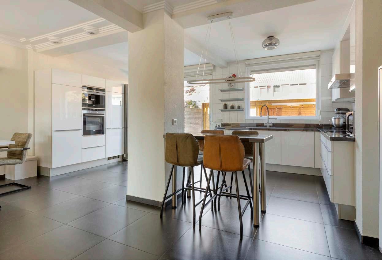 Aan de achterzijde bevindt zich de open keuken in een ruim opgestelde L-indeling. De goed onderhouden keuken, compleet met bar, biedt volop werkruimte en is ideaal voor zowel doordeweekse maaltijden als gezellige avondjes kokkerellen. Door de schuifdeuren naar de tuin wordt de verbinding tussen binnen en buiten versterkt, perfect tijdens zonnige dagen!