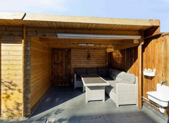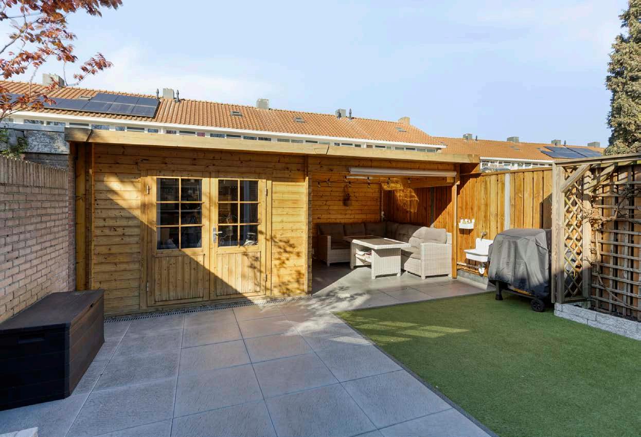 En dan de tuin... Wat een fijne plek. De achtertuin is onderhoudsarm aangelegd en geeft meer ruimte om van te kunnen genieten. De westelijke ligging betekent dat je hier bijna de hele dag zon hebt. Hier is werkelijk alles wat je zoekt: een houten berging met stroomvoorziening, een overkapping die perfect is voor loungen of een BBQ, én een achterom die uitkomt op de brandgang.
