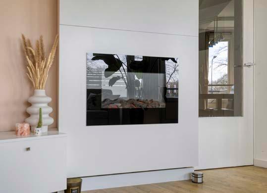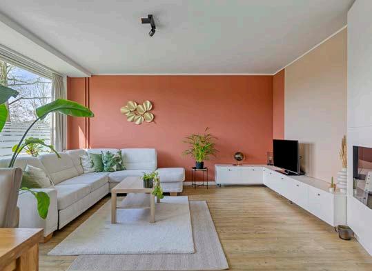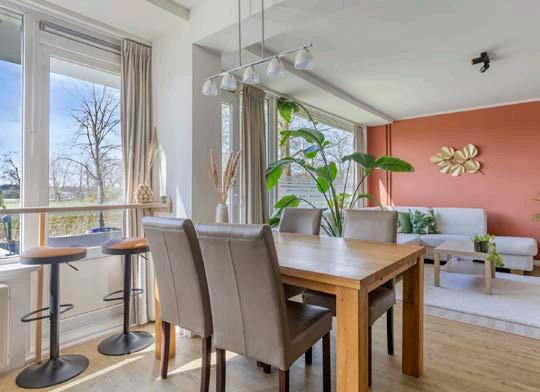 De ruime woonkamer is een plek waar je het liefst iedere dag doorbrengt. Dankzij de grote raampartijen wordt de ruimte overspoeld met natuurlijk licht, dat gedurende de dag zorgt voor een warme en gezellige sfeer. Het vrije uitzicht op de groene, rustige omgeving is een verademing en biedt je alle privacy. Dit is dé ruimte om te ontspannen, een goed boek te lezen of om vrienden en familie te ontvangen. De zon speelt een hoofdrol, vooral in de middag en avond, waardoor de woonkamer voelt als een echte thuishaven.