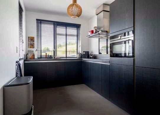 De keuken, aan de voorzijde van de woning, is een toonbeeld van stijl en functionaliteit. De L-vormige opstelling met donkere, greeploze fronten zorgt voor een moderne look. Hier ontbreekt het je aan niets: voldoende werkblad, talloze opbergmogelijkheden en alle apparatuur die je nodig hebt.
