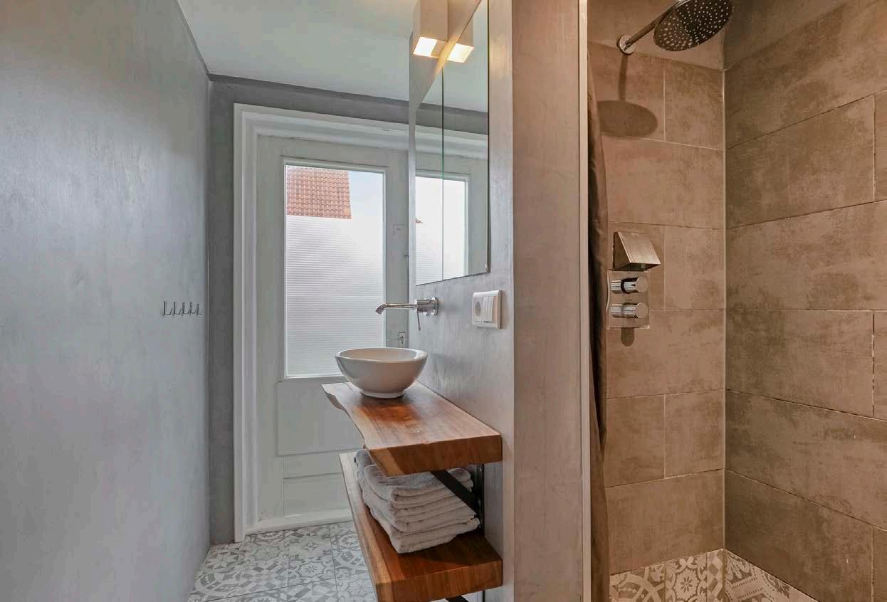 De moderne badkamer is afgewerkt met cire beton en beschikt over alle gemakken: een inloopdouche, toilet, wastafel en toegang tot een dakterras. Hier geniet je ongestoord van de zon en een prachtig uitzicht over de buurt.