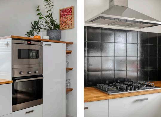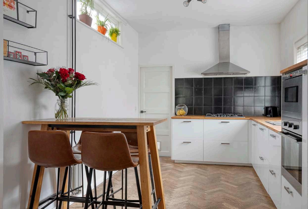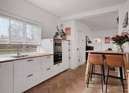 Koken wordt een feestje in deze praktische én smaakvolle keuken. De hoekopstelling is uitgevoerd met een stijlvol houten aanrechtblad, handige apothekerskast en moderne apparatuur zoals een 5-pits gaskookplaat, vaatwasser en combimagnetron. Door het zijraam baadt dit deel van het huis bovendien altijd in een zee van daglicht.